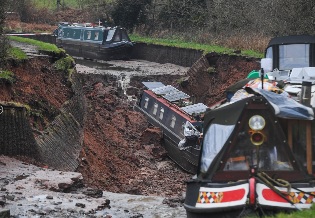 Британська влада повідомила про серйозний інцидент у графстві Шропшир, Англія, після того, як через утворення провалля на каналі судна застрягли у величезній порожнині або балансують на краю прірви.